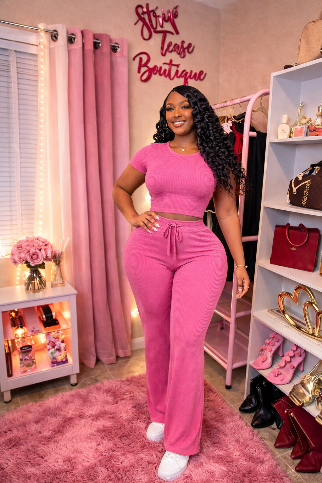 Sweet, stylish, and effortlessly comfortable — the Pink Sugar Lounge Set is the perfect outfit for when you want to look cute without sacrificing comfort. This soft ribbed two-piece set features a flattering fitted crop top paired with high-waisted drawstring lounge pants that hug your curves while giving you a relaxed feel.